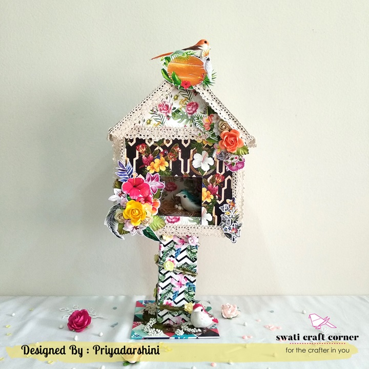 I have a beautiful project to share here today and its a bird house made using pattern papers from Swati Craft Corner. The papers used here are Tropical paradise which is perfect for bird and tropical theme projects. The coordinating motif sheet has gorgeous elements that work perfectly with projects.